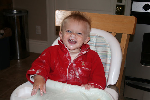 He's learning new words every day. I tried to make a list of his currently vocabulary, but it's too hard to keep track. A few of his favorite words are: book, blanket, drink, hot, Creed, and wow.